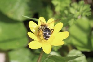 Non loin de là rôdent les nomades, des abeilles-coucous spécialisées, parasites des abeilles sauvages du genre Andrena : à chaque andrène sa nomade quasi attitrée ! Pour l’Andrène gravide, c’est plutôt la Nomade bifasciée (Nomade bifasciata).
