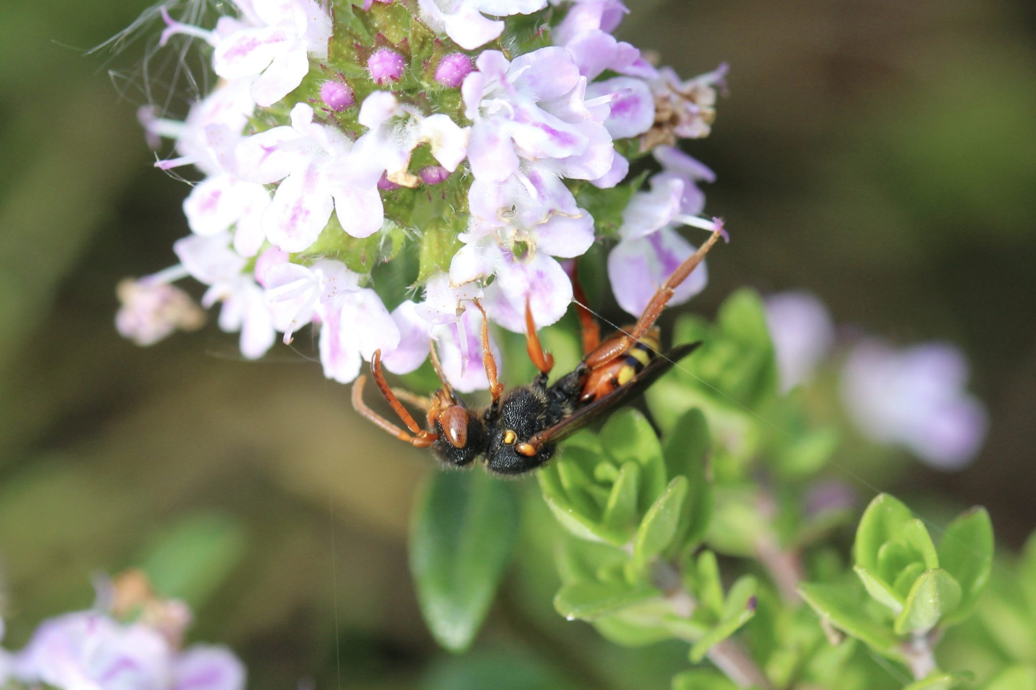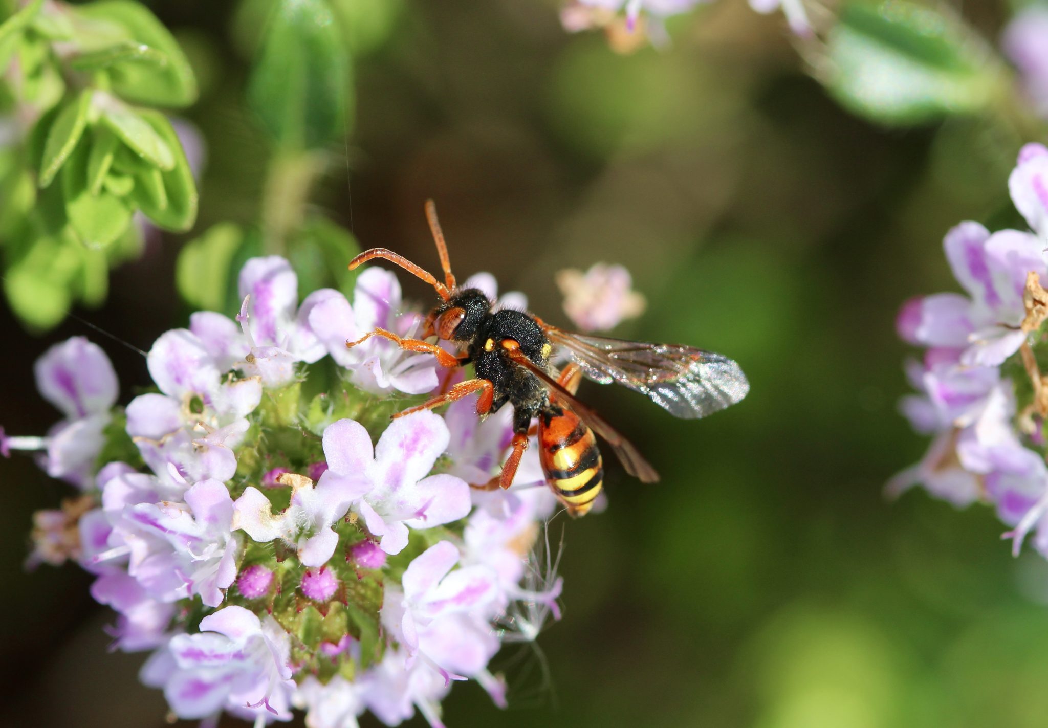 On dirait une petite guêpe, noire et jaune, comme toutes les nomades, rehaussée ici de rouge orangé : antennes, pattes et premiers segments de l’abdomen.
