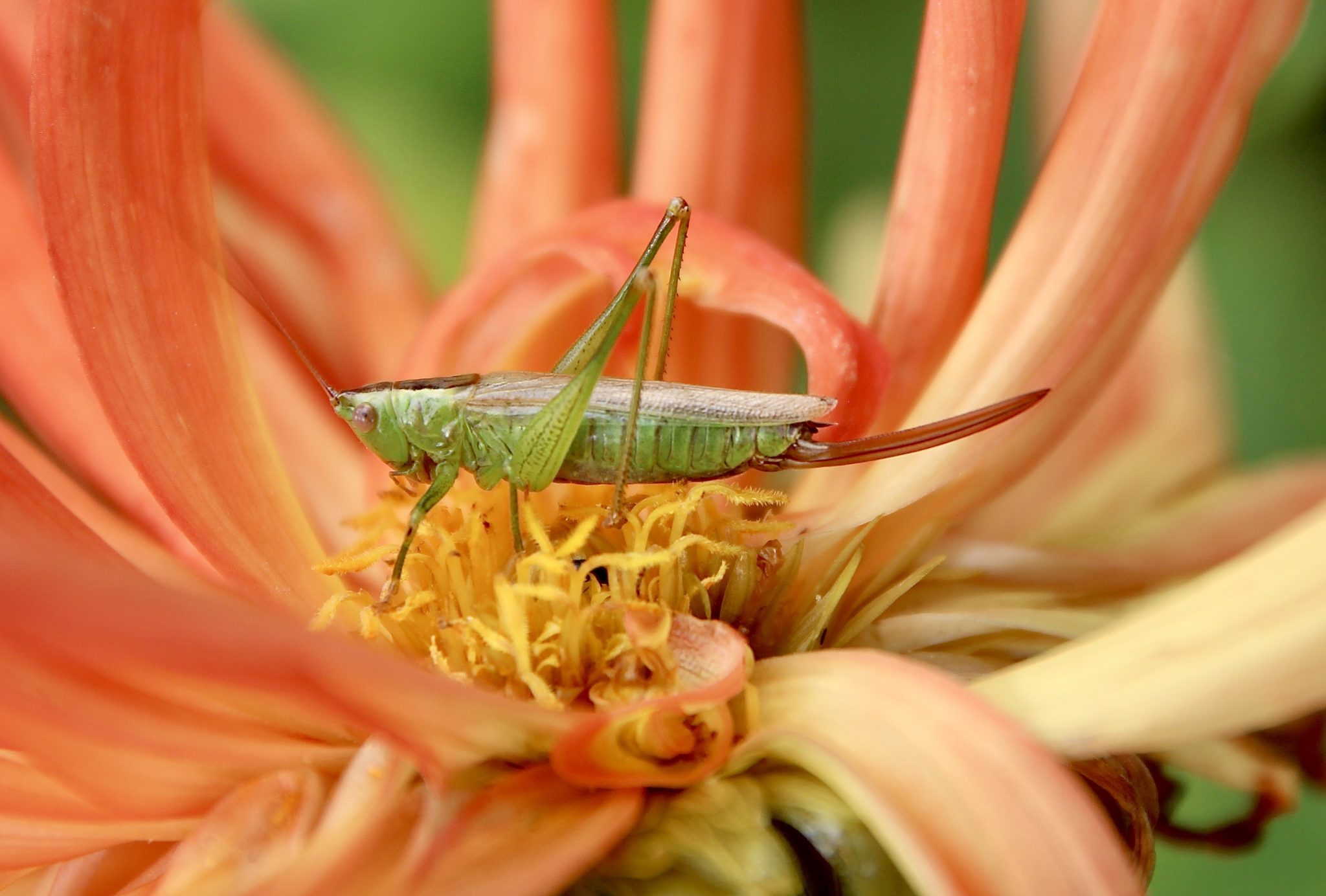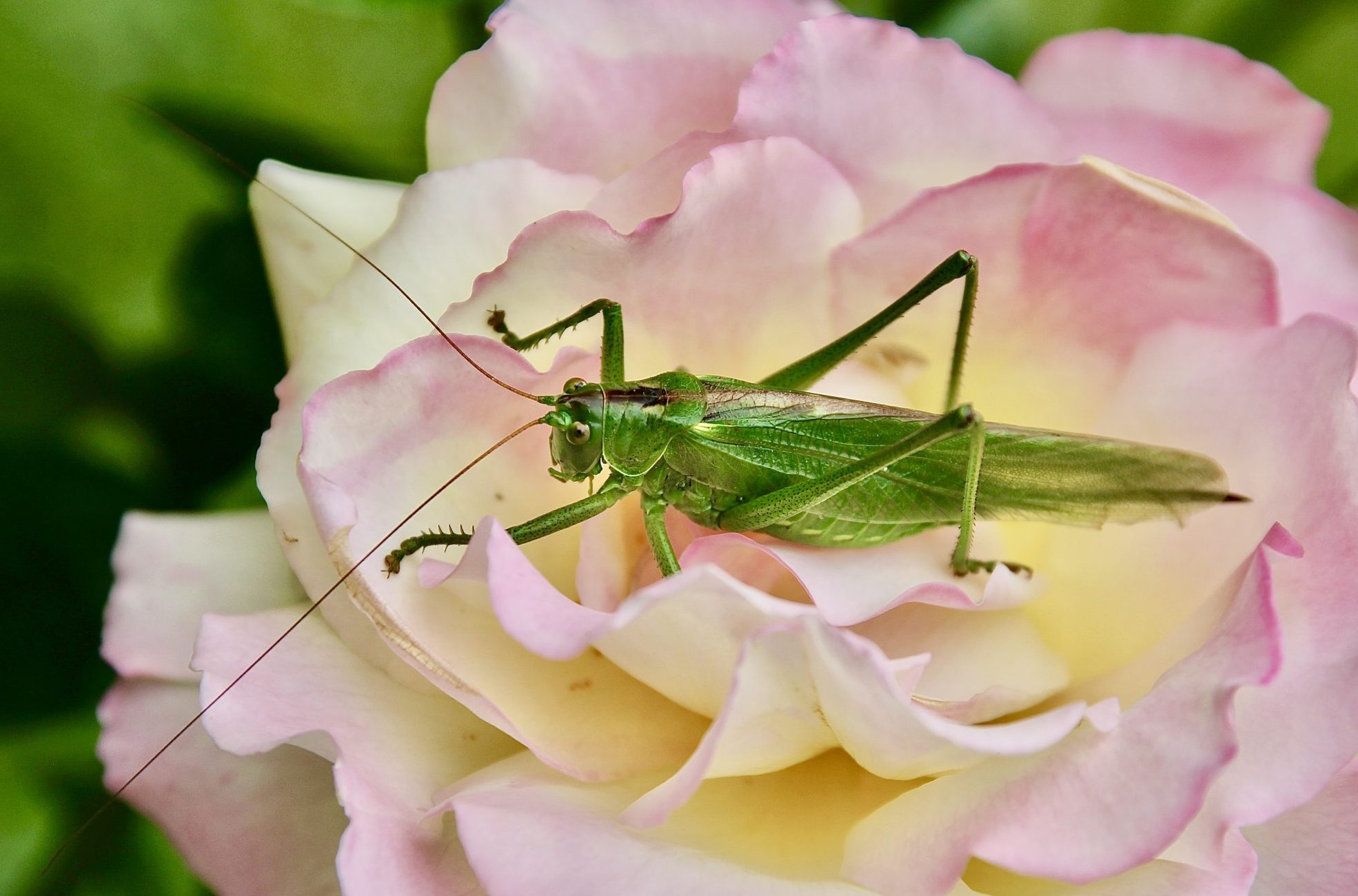 Le criquet est exclusivement herbivore. La sauterelle est généralement omnivore, parfois carnassière. Ainsi la Grande sauterelle verte, plutôt voyante lorsqu’elle chasse au coeur d’une rose !
