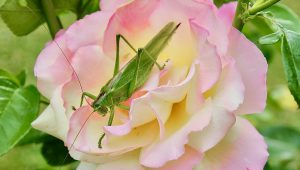 Le criquet est exclusivement herbivore. La sauterelle est généralement omnivore, parfois carnassière. Ainsi la Grande sauterelle verte, plutôt voyante lorsqu’elle chasse au coeur d’une rose !