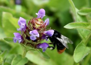 Sans oublier la Brunelle commune. Et ce ne sont pas les butineurs qui s’en plaindront. Tout particulièrement les bourdons. Et pourtant, regroupées en épi, émergeant de bractées rougeâtres, les petites fleurs bleu-violacé de la Brunelle semblent taillées pour des visiteurs moins corpulents…
