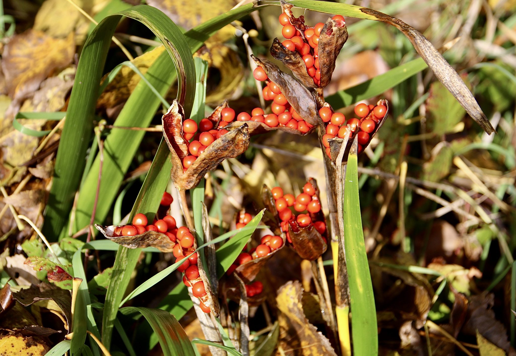 Très discrètes au printemps, les fleurs de l’Iris gigot réservent leur surprise pour l’automne, avec des grappes rouge orangé du plus bel effet.