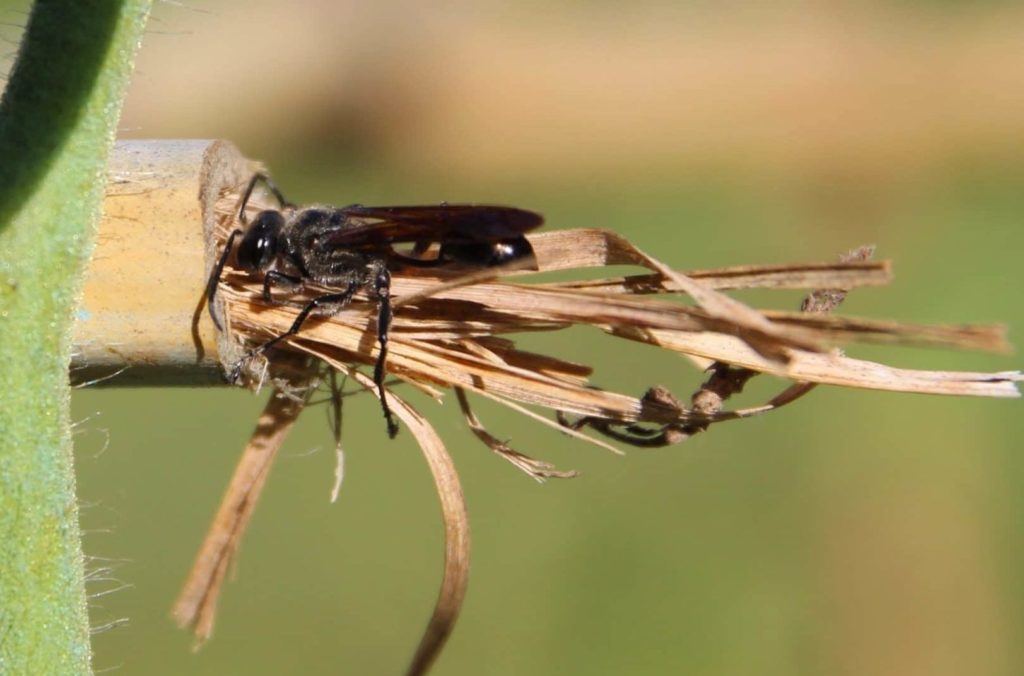 Un long brin de raphia à pleines bandibules… À quel étrange manège cette guêpe noire se livre-t-elle au potager ? Évidemment, l’Isodonte mexicaine (Isodontia mexicana) n’est pas là pour donner un coup de main à l’attache des pieds de tomate !