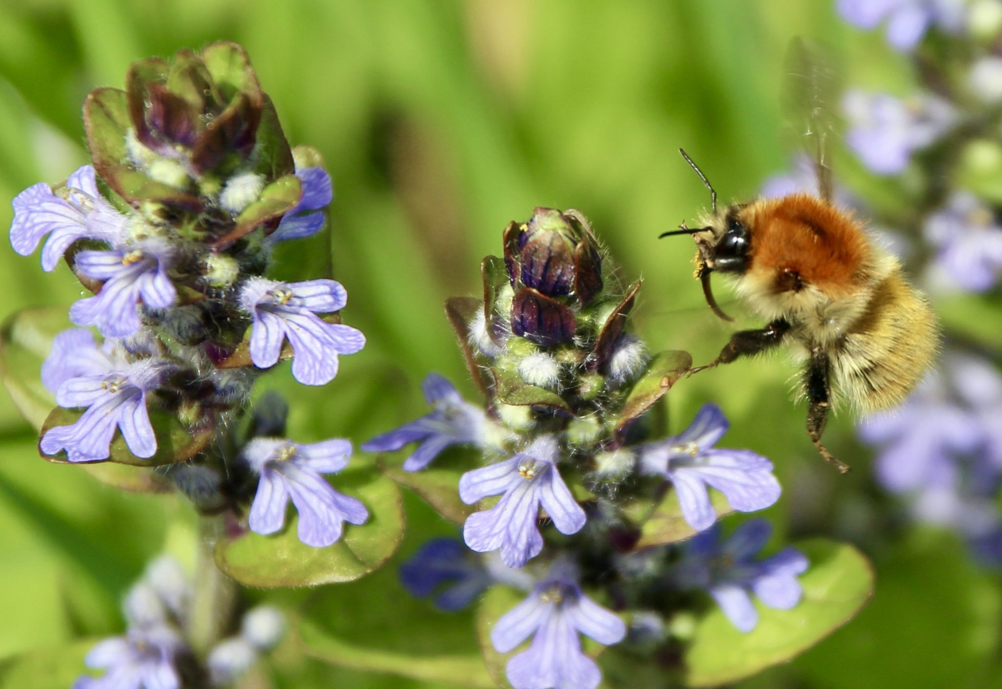 Elle côtoie le Lamier pourpre et le Lierre terrestre au pied des haies. Pas de risque de confusion. La Bugle rampante dresse un bel épi serré où le bleu-violacé des petites fleurs se mêle au vert puis au bronze d’un feuillage qui fonce et rétrécit en progressant vers le sommet de la pyramide.