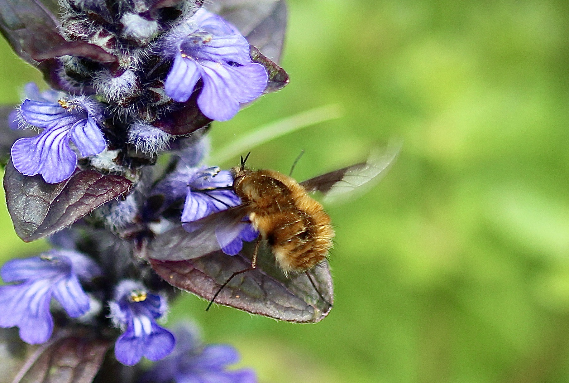 de la Bugle rampante présente deux lèvres ouvrant sur un long tube nectarifère. Et la lèvre inférieure à trois lobes reçoit logiquement les butineurs. Mais, au dessus, curieusement, la lèvre supérieure est atrophiée. Pour ne pas dire inexistante. Étamines et styles, qui en débordent largement, ne bénéficient donc pas d’auvent protecteur.