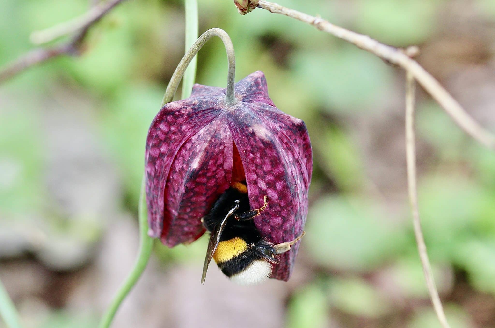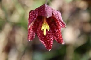 Bonnet d’évêque, Coquelourde, Tulipe des marais… Quel que soit son nom populaire, la Fritillaire pintade est fidèle au rendez-vous de la fin d’hiver. Pour quelques semaines, elle illumine discrètement les pairies humides, ici et là, par petites colonies. Avec son port gracile, elle hisse le damier pourpre et blanc de ses corolles renversées jusqu’à une cinquantaine de centimètres. Étroits, obtus, les sépales protègent un faisceau de six étamines aux anthères chargés de pollen jaune. Au centre émerge un style unique porteur de trois stigmates verdâtres.