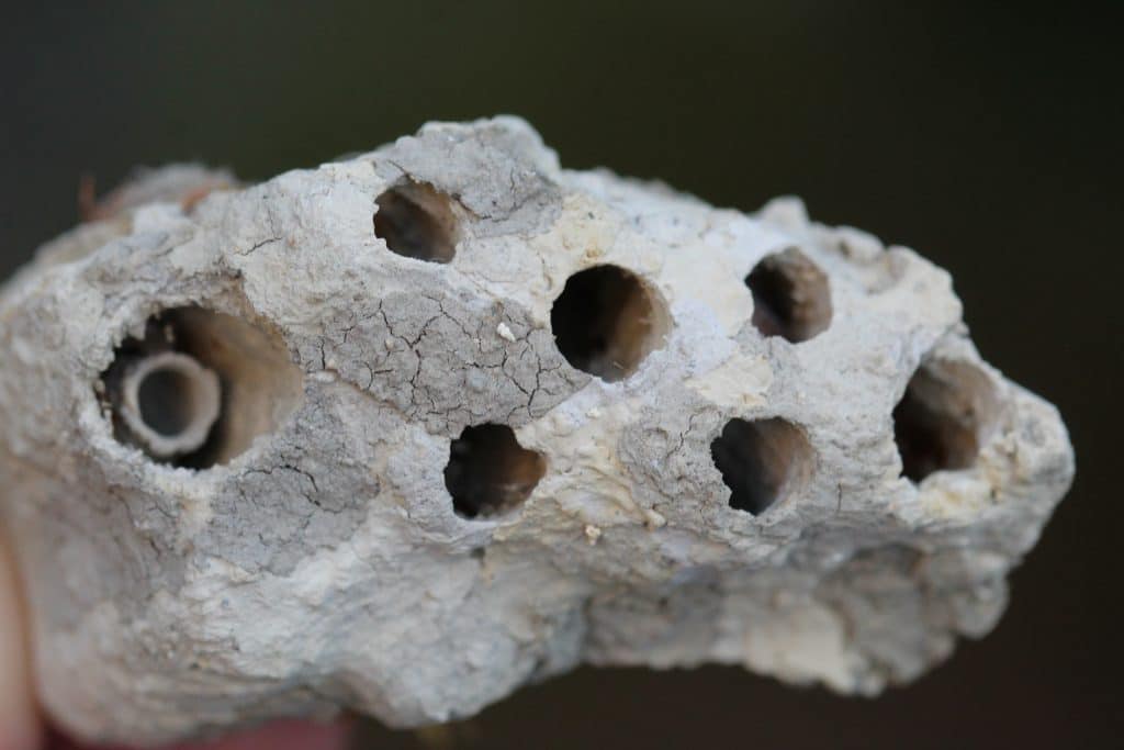Fragment d’un nid de Pélopée : ses cellules individuelles maçonnées l’une après l’autre et accolées avec de la boue.