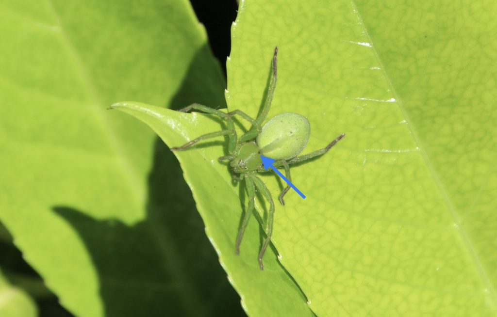 Petite fantaisie : tarses et métatarses sont franchement bruns. Ce qui vaut parfois au Micrommate de Lugurie le surnom d’araignée verte « à chaussettes » ! C’est un des critères d’identification de l’espèce, avec un point noir à l’arrière du thorax. Un de ses cousins, le Micrommate émeraude (Micrommata virescens)  est en dépourvu.