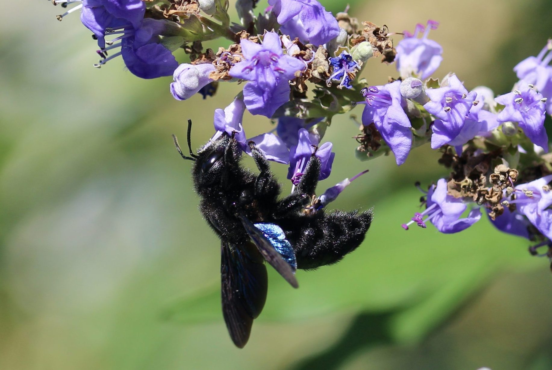 Sur le terrain, cette distinction entre mâle et femelle de l’Abeille charpentière (Xylocopas violacea) est assez facile à observer.