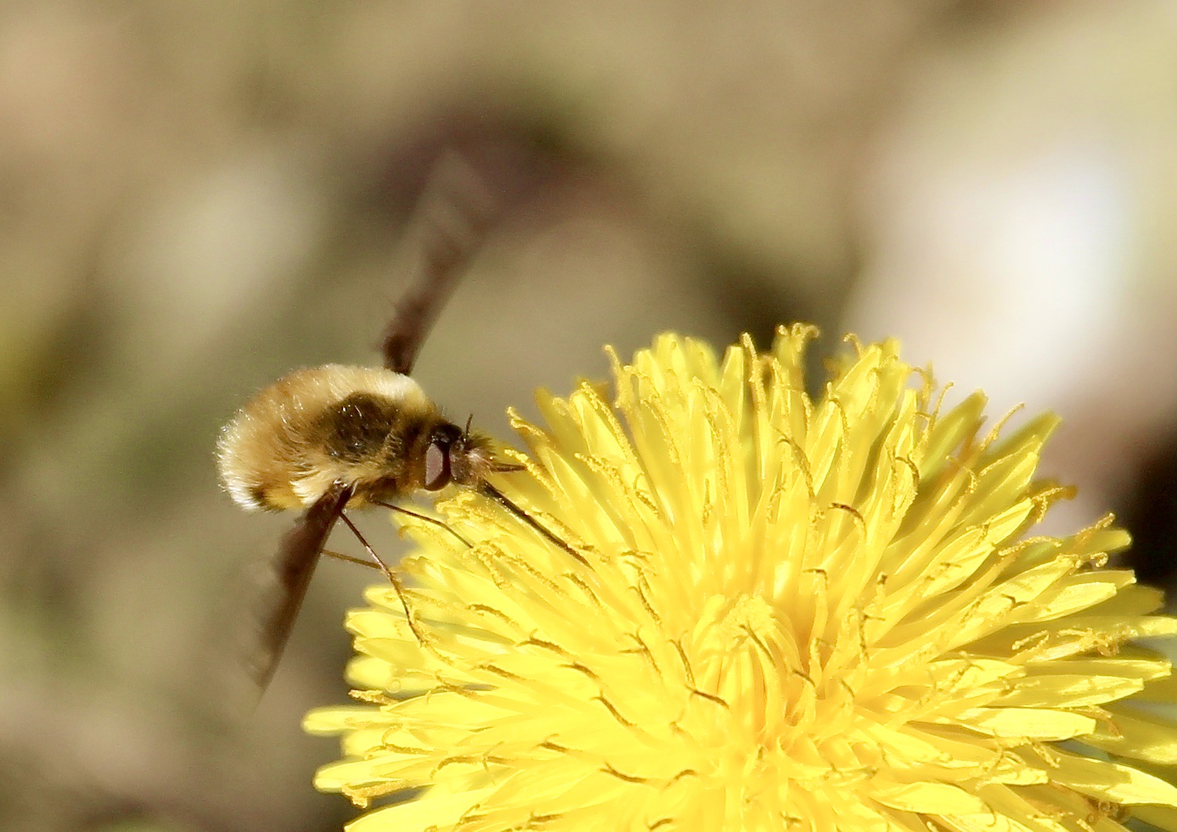 Le Grand bombyle en vol stationnaire au dessus d’un capitule de pissenlit.