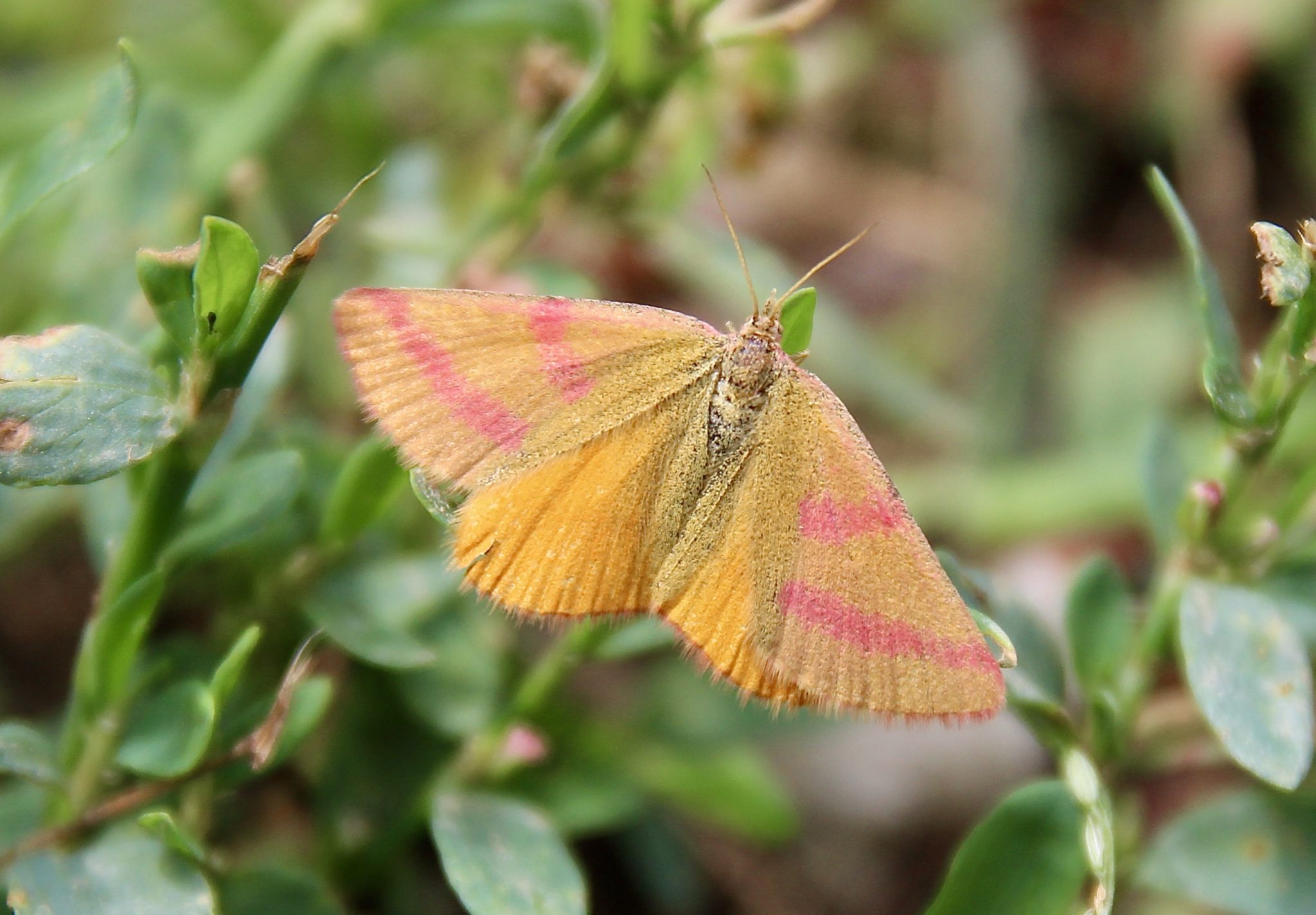 Jaune ocre et rose vif plus ou moins diffus : l’Ensanglantée des renouées volète le jour dans la végétation basse.