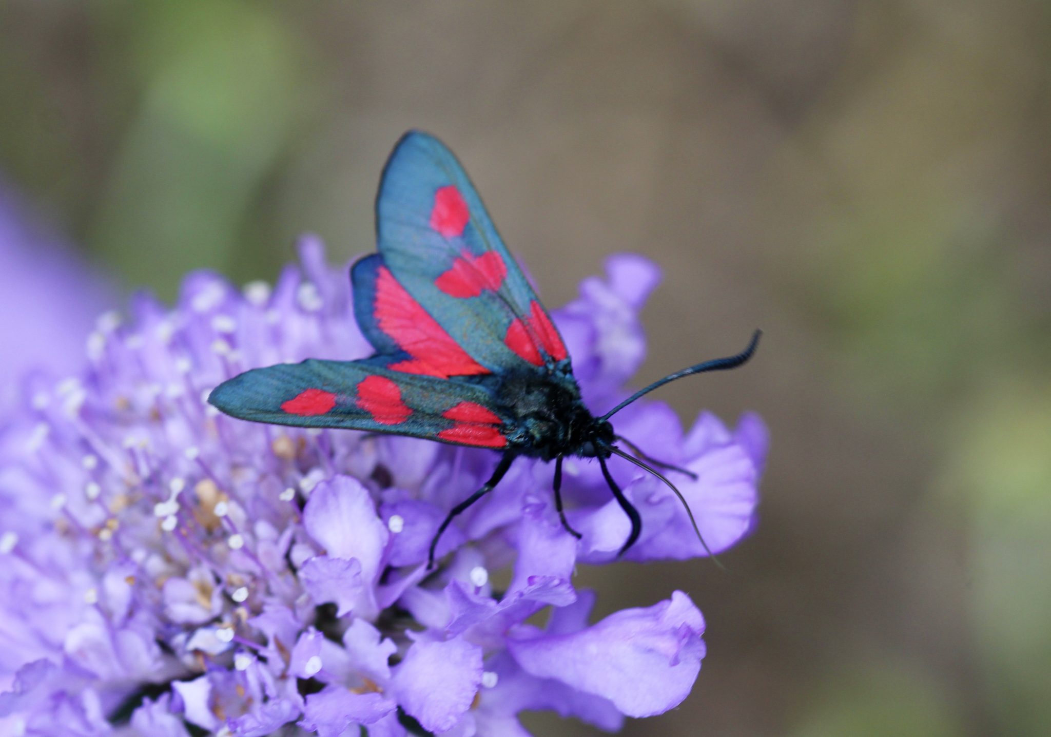 Cinq taches rouge-sang sur fond noir bleuté : la Zygène du trèfle, une visiteuse paisible au jardin. De nuit comme de jour.