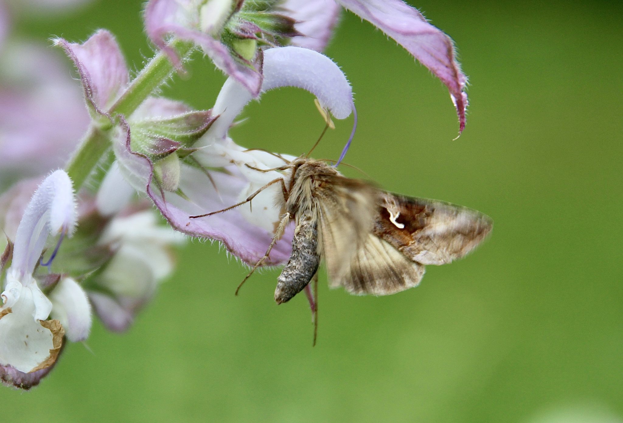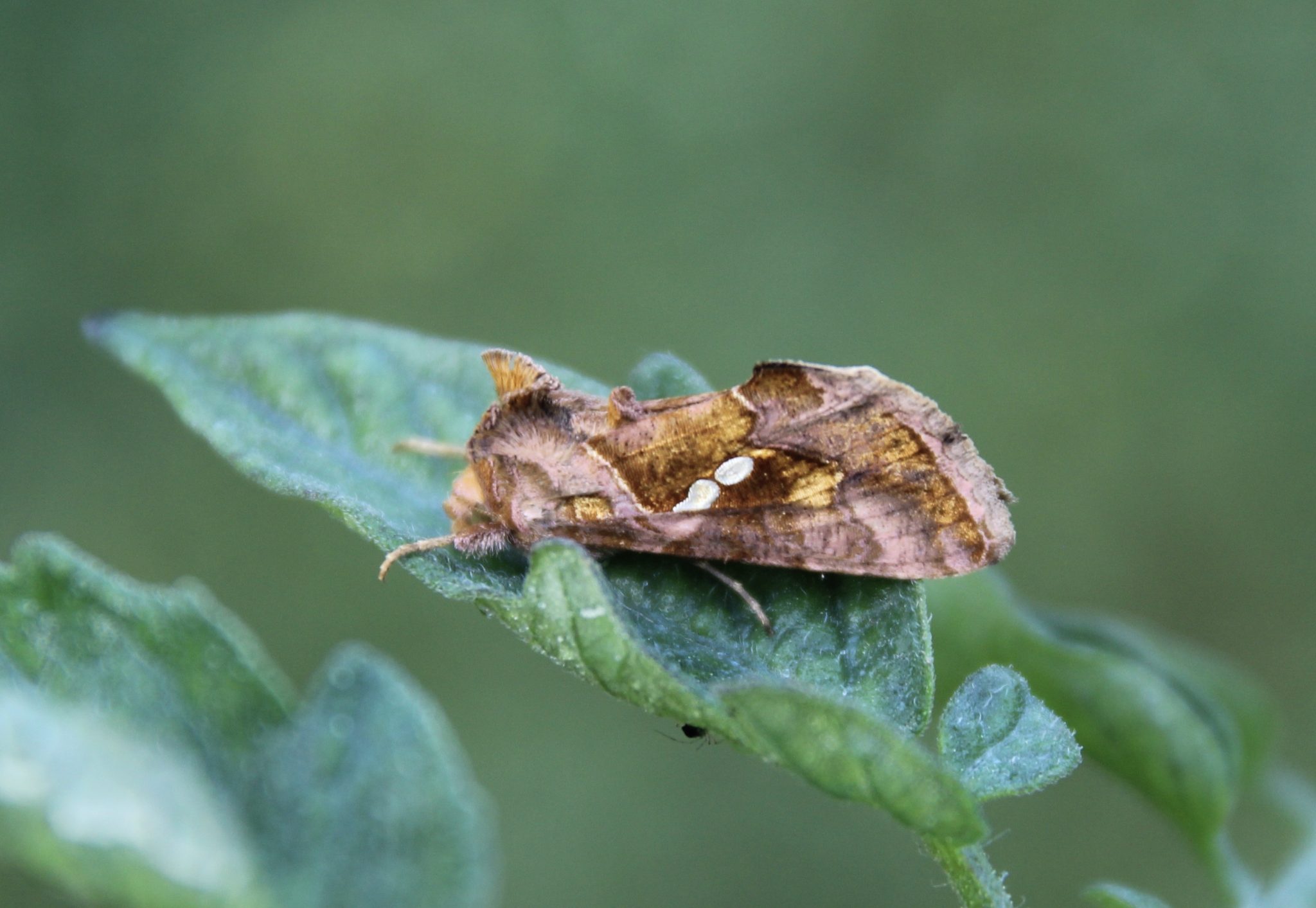 Une noctuelle mordorée à la silhouette un peu cabossée. Les chenilles de la Plusie chalcite apprécie le feuillage des tomates. Mais pas que !