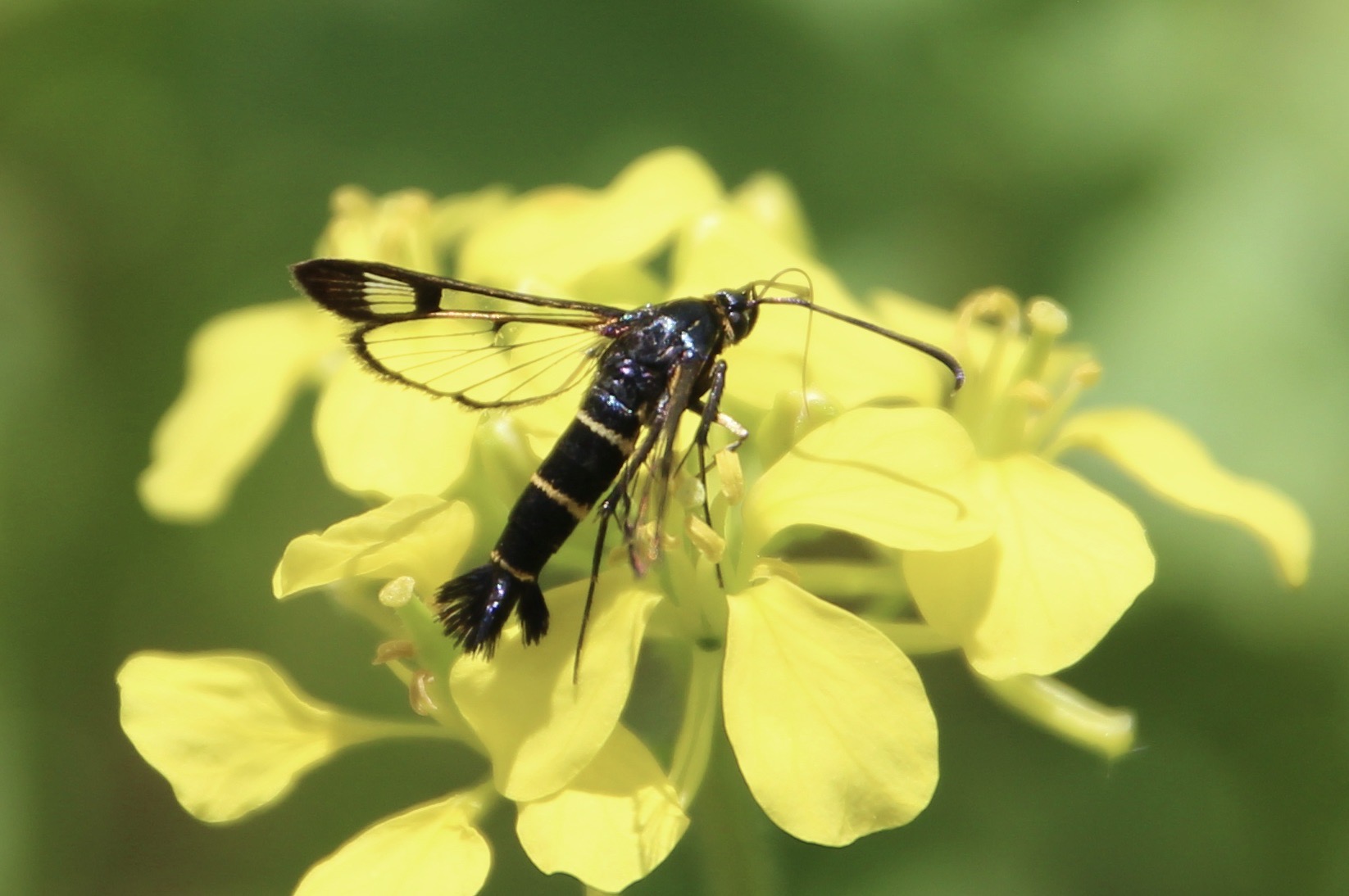 Des anneaux abdominaux jaunes sur une dominante noire. La Sésie du groseillier se distingue aussi à ses étroites ailes hyalines et noires.