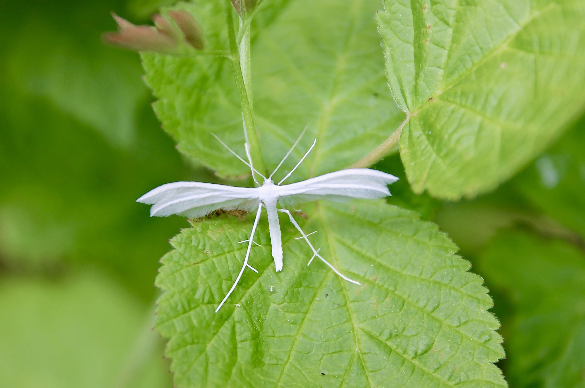 Suspendu à une herbe ou à l’arrière d’une feuille, le Ptérophore blanc garde étendues ses curieuses ailes plumeuses. Comme un perpétuel orant.